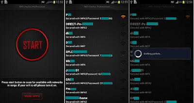 App kedua adalah WiFi Hacker Professional, sistem dari aplikasi pembobol wifi untuk Android ini juga sangat sederhana. Dimana sobat hanya perlu menekan tombol Start, nantinya aplikasi ini akan mulai melakukan scanning pada jaringan Wifi yang terjangkau oleh hp Android dan nantinya akan menampilkan masing-masing password dari jaringan WiFi tersebut.